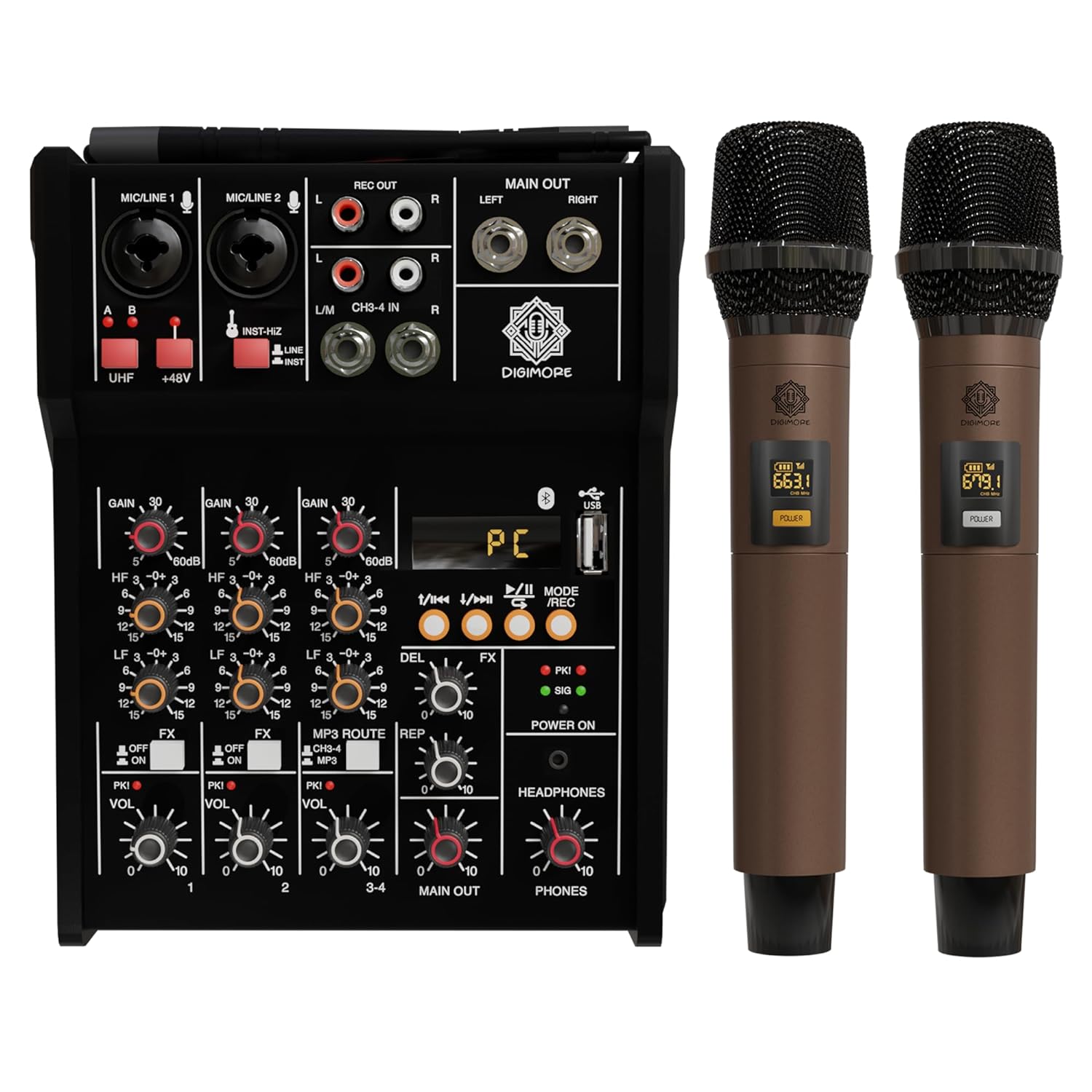 Be the first to review “DIGIMORE 4 Channel Professional Audio Mixer with Dual UHF Wireless Mics 250 feet range, Supports MP3, Bluetooth, 48V Phantom Power DJ Mixing for Home Karaoke Party, Live Band, Small Events (D-300)” Cancel reply