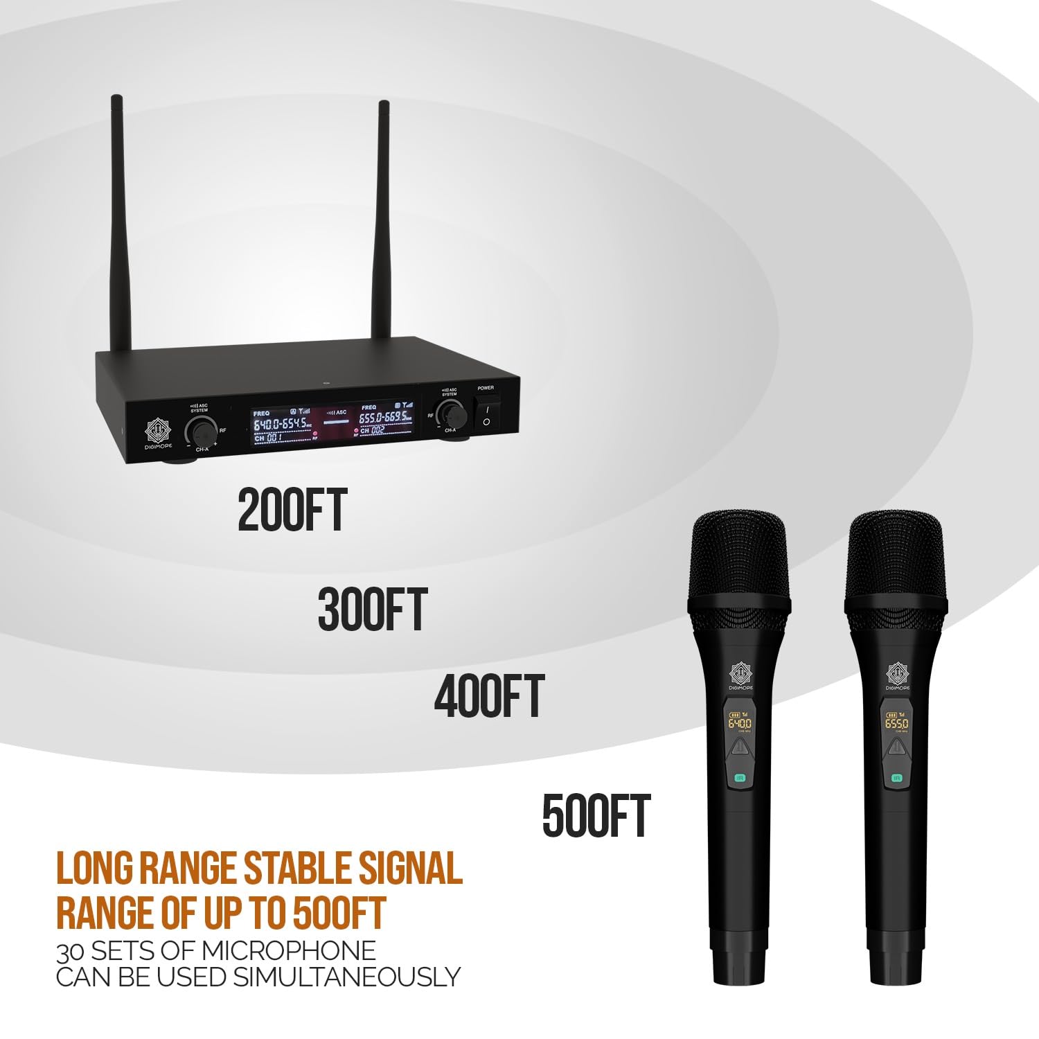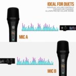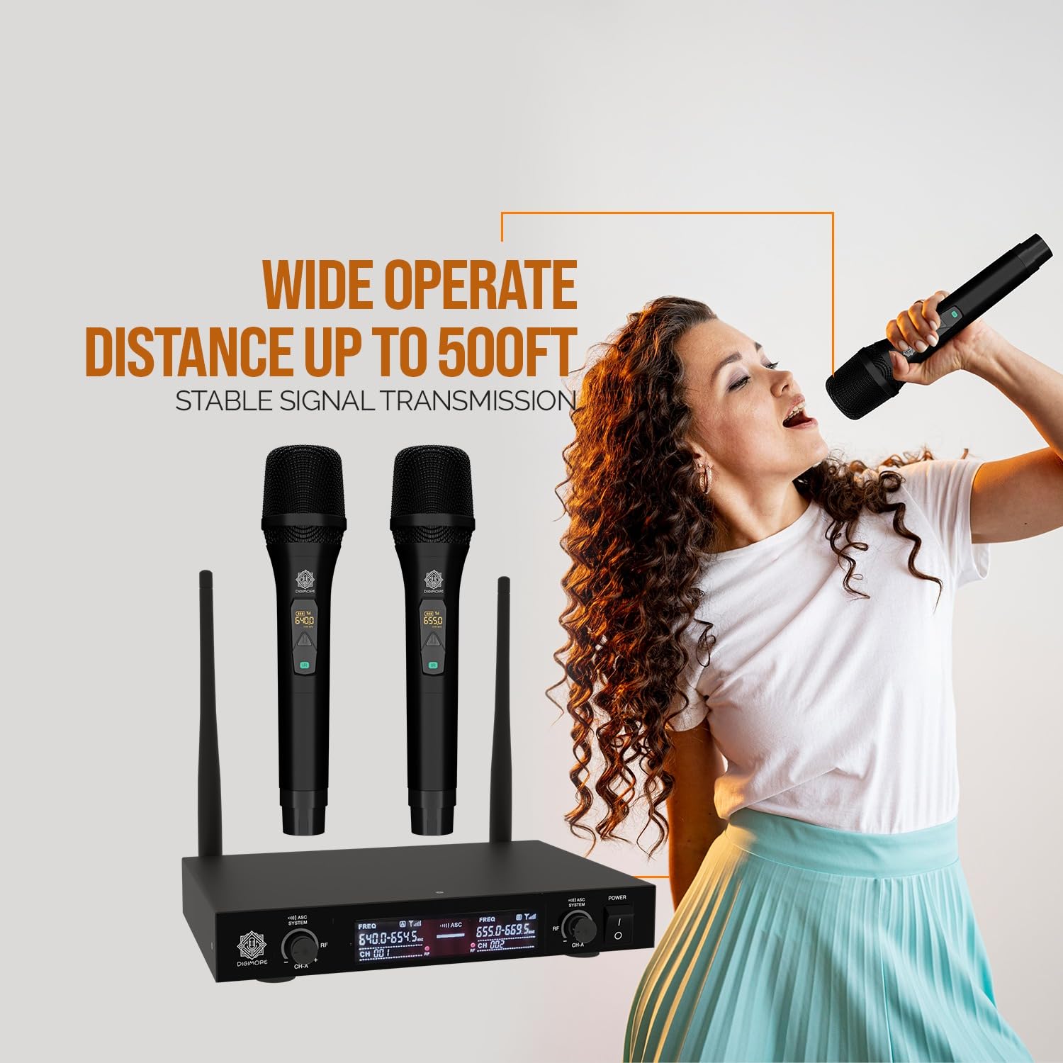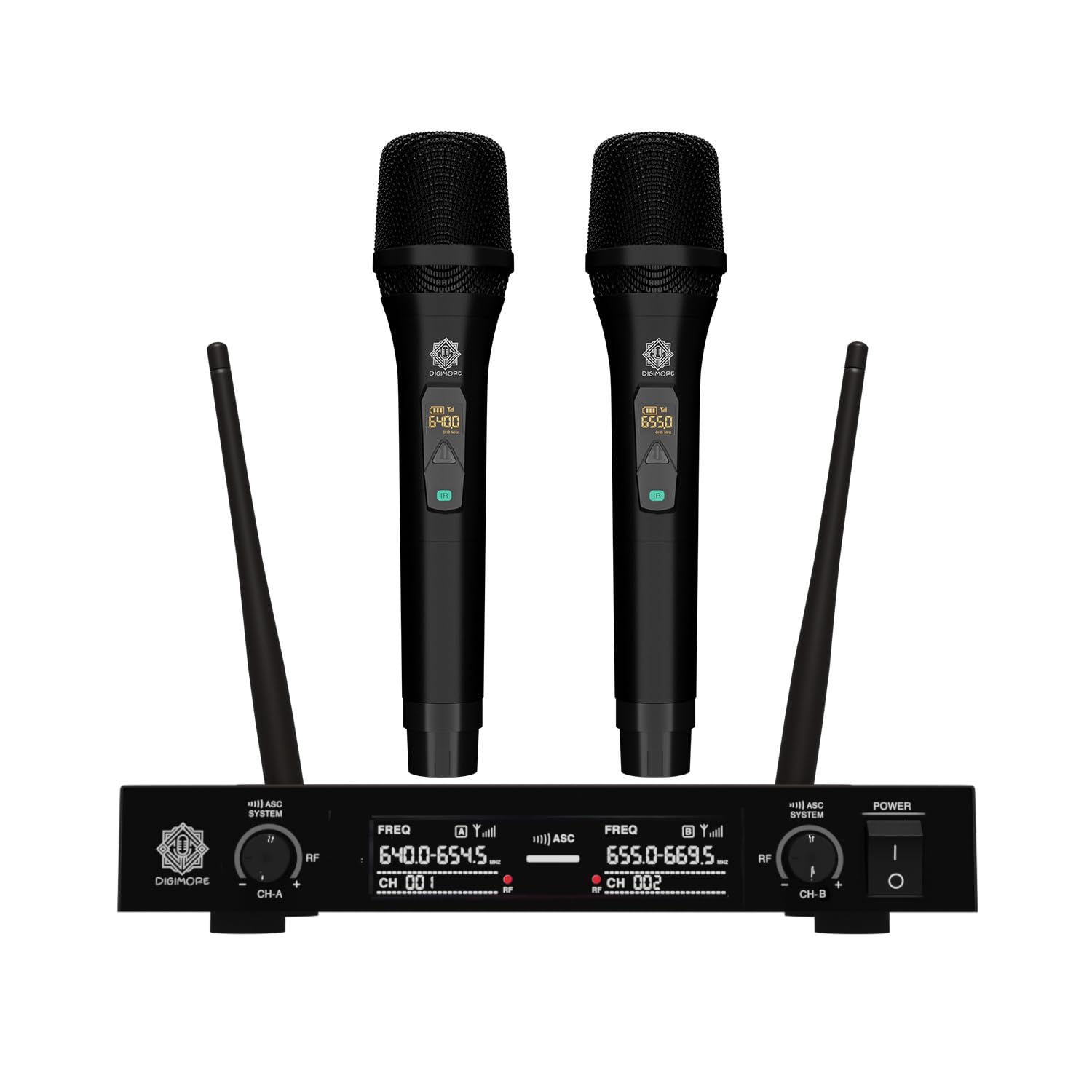 • DUAL CHANNEL: This black wireless microphone system by Digimore has dual frequency channel and broad audio response range with low distortion so you can enjoy cordless singing to karaoke music and mobility for energetic on stage performance