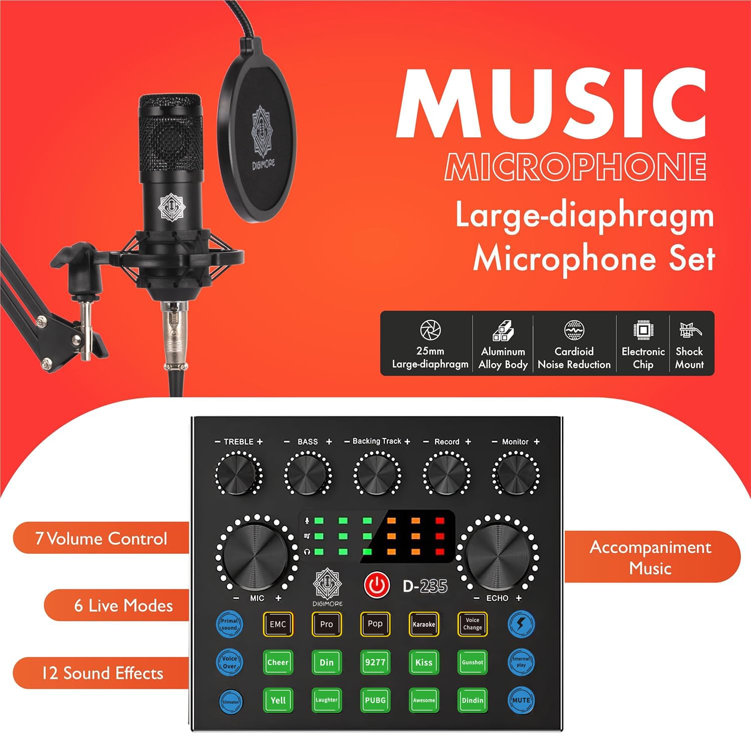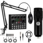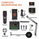 Great Podcast Equipment Bundle: The Podcast Equipment Bundle is equipped with black D-430 microphone, Mic adjustable suspension scissor arm stand, Shock Mount, Pop Filter, and D-235 live sound card. This recording studio package was designed for singing, podcasting, streaming and recording music and short video. What you get is a complete set of podcast microphone bundle.