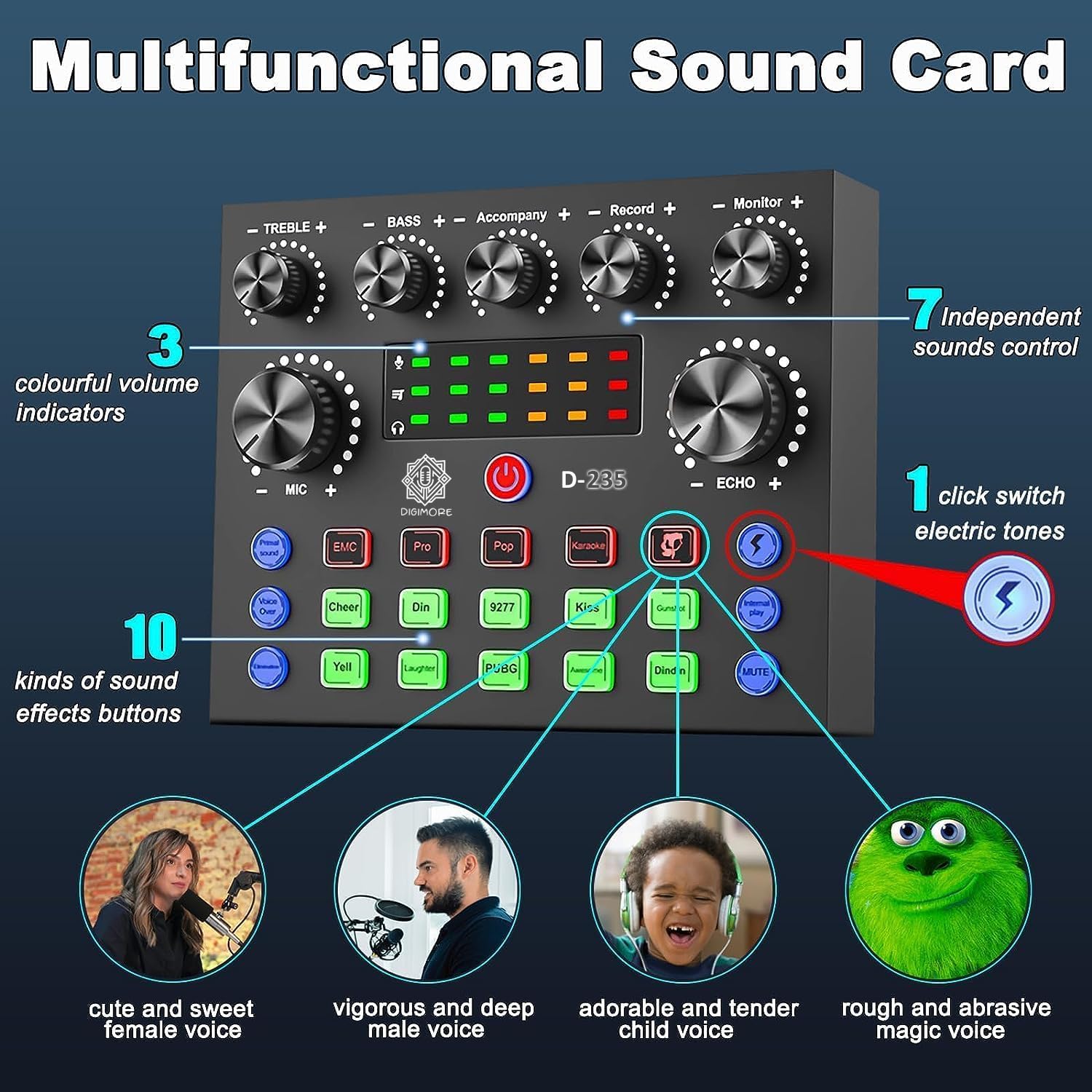 Plug and Play & Easy To Use : The D-235 sound card with multiple sound effects can be used on any mobile phone, computer, and Any game platform. You can connect to different devices (computer/ mobile phone/ laptop) by using different connection methods.