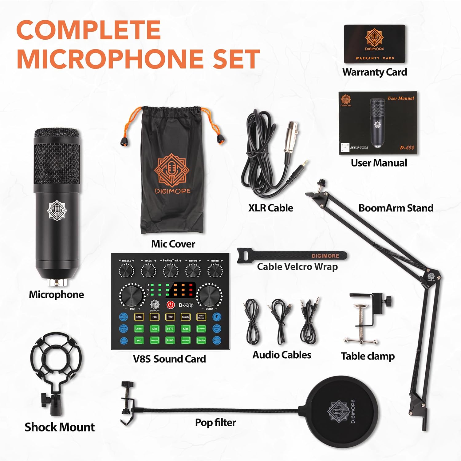 Be the first to review “DIGIMORE Condenser Mic for Singing with V8 Sound Card | Condenser Microphone Kit | Voice Changer | Studio Recording Equipments Full Set, Voice Recorder Mic, Karaoke, Gaming, Podcast & Lecture (D-430)” Cancel reply