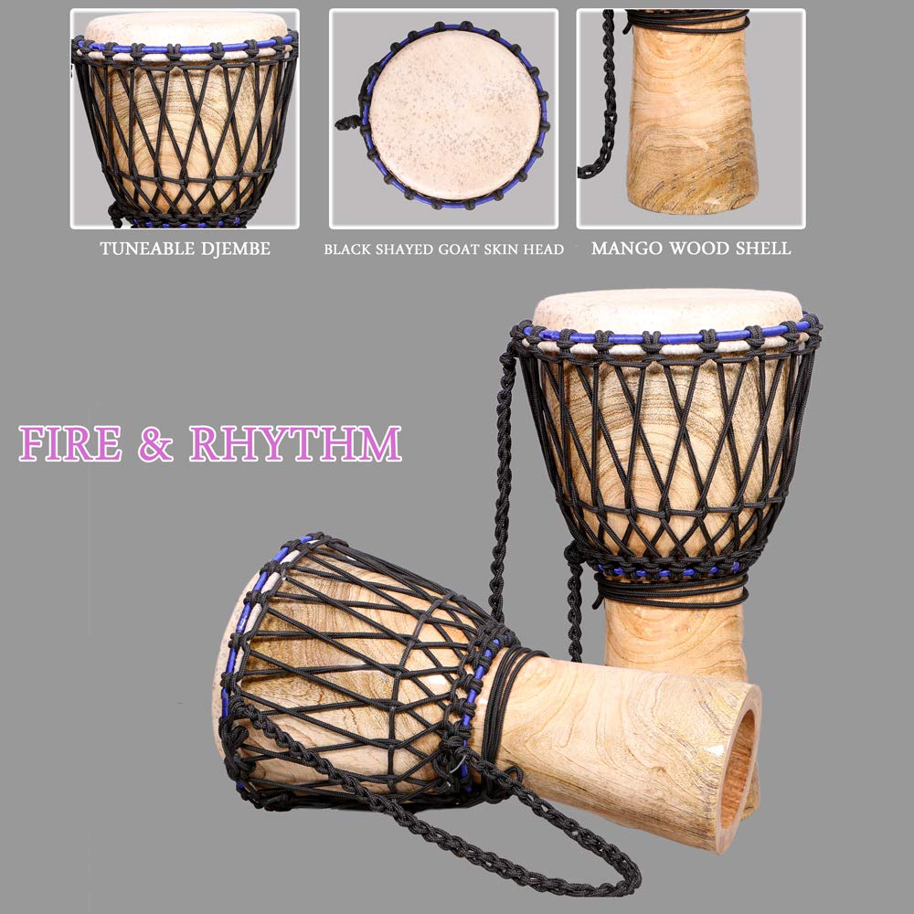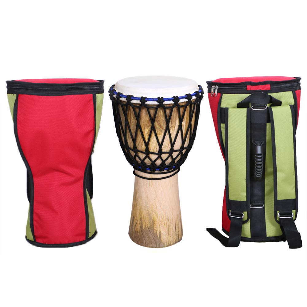 - Available in two styles that is tuneable and rope tuned djembes. The colour of the product is water proof and very easy for maintenance. The package includes djembe, premium quality multicolor bag and belt. Dimensions are 10 inch head 20 inch tall.