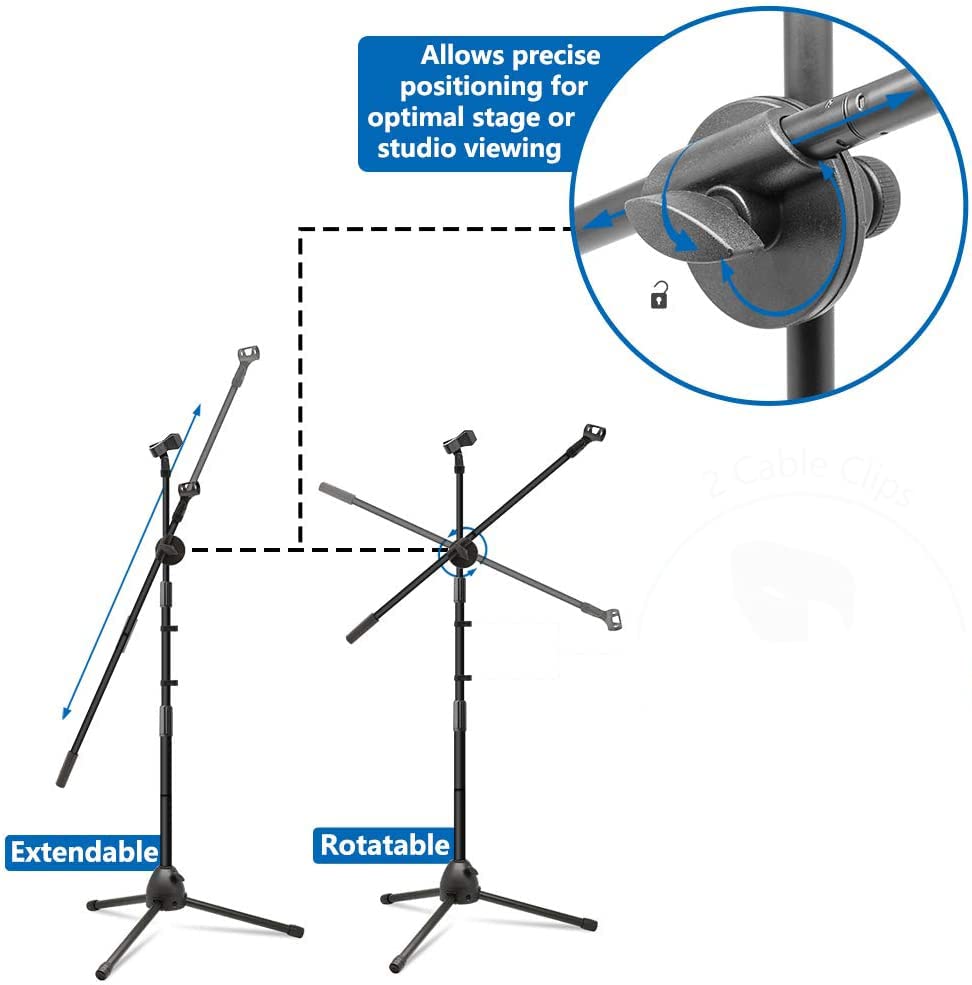 - Adjustable Mic Holder – Newly design supports this dual boom mic stand in holding a microphones at a time that makes group performance so much easier(Max load:2.2lb). The main stand can extend from 31.5 to 52 inches by quality height clutch, the boom arm is 30 inches with 360° rotation, the quick-release clamp helps it to be locked into position easily for both stand and sit using.